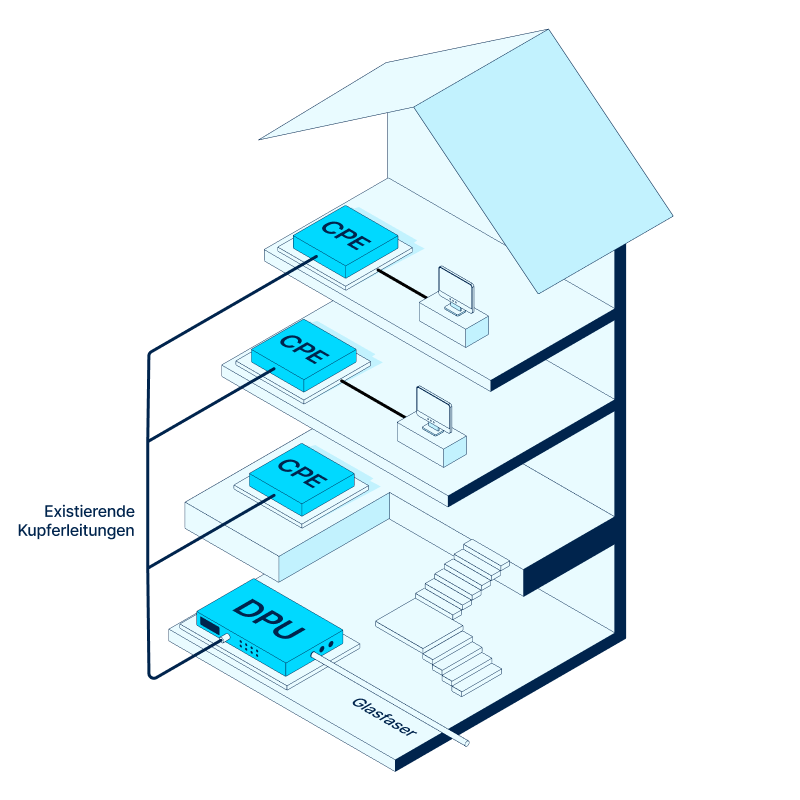 Die DPU wandelt das optische Signal der Glasfaserleitung in elektrische Signale für die Verarbeitung durch Kupferverkabelung. Mithilfe von Baluns kann auch Koaxverkabelung genutzt werden. Das macht G.fast besonders breit einsetzbar, auch bei gemischten Verkabelungsstrukturen.