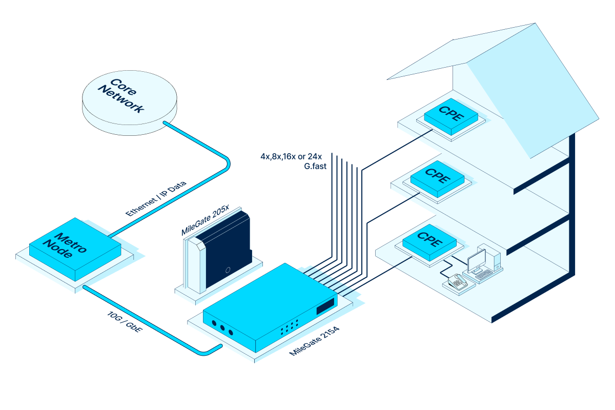 Anders als bei FTTH müssen bei G.fast bestehende Kupfer- oder Koaxleitungen in den Gebäuden nicht ausgetauscht werden. Der Glasfaseranschluss wird bis zum Anschlussraum, in der Regel im Keller der Immobilie, geführt (FTTB). Dort wird eine Distribution Point Unit (DPU) installiert. Bauliche Eingriffe in Leitungen, Innenwänden oder Wohnungen entfallen, sodass Anwohner nicht weiter beeinträchtigt werden.